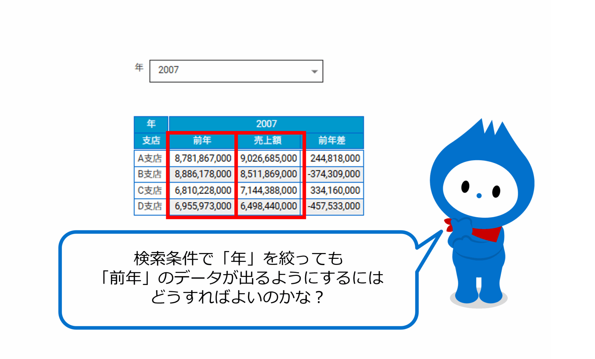 検索条件で当年を選択した際、前年のデータも表示して比較をしたい!